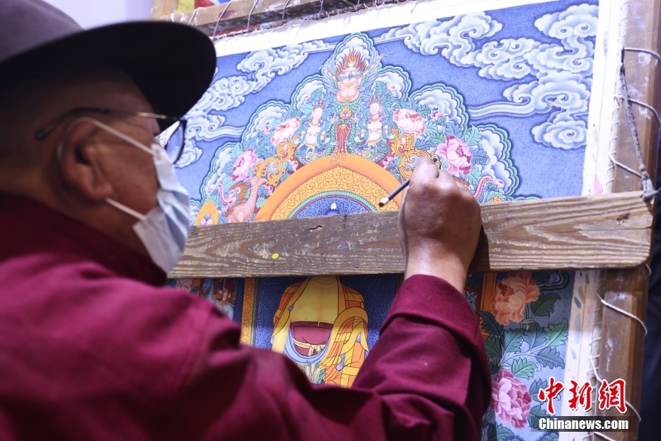5月23日,“2023·中國西藏發(fā)展論壇”在北京舉行。會場外,活潑獨特的藏式迎賓舞蹈、展示西藏人文自然風(fēng)貌的圖片,已在論壇開幕前預(yù)熱起探討西藏新發(fā)展的氛圍。圖為藏族藝人現(xiàn)場進行唐卡繪制。
