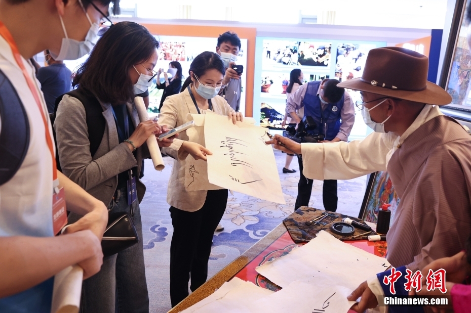 5月23日,“2023·中國西藏發(fā)展論壇”在北京舉行。會場外,活潑獨特的藏式迎賓舞蹈、展示西藏人文自然風(fēng)貌的圖片,已在論壇開幕前預(yù)熱起探討西藏新發(fā)展的氛圍。圖為藏族藝人現(xiàn)場進行藏文書法創(chuàng)作并將作品贈送給來賓。