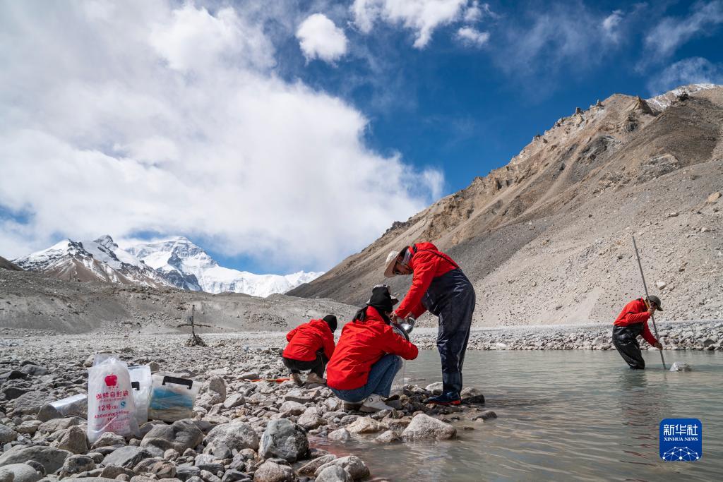 在珠峰登山大本營附近,來自西藏大學(xué)生態(tài)環(huán)境學(xué)院的科考隊員在進行水生態(tài)調(diào)查(5月22日攝)。新華社記者 孫非 攝