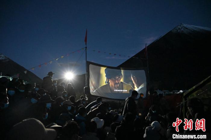 晚上9時(shí)許,山谷沉入暮色,吃過晚飯,電影放映員見參開啟設(shè)備放映了藏語版《湄公河行動(dòng)》。前來觀看電影的村民席地而坐,不似都市電影院,在這沒有影院標(biāo)配座椅、爆米花,卻有著星空下的超級觀感體驗(yàn)。