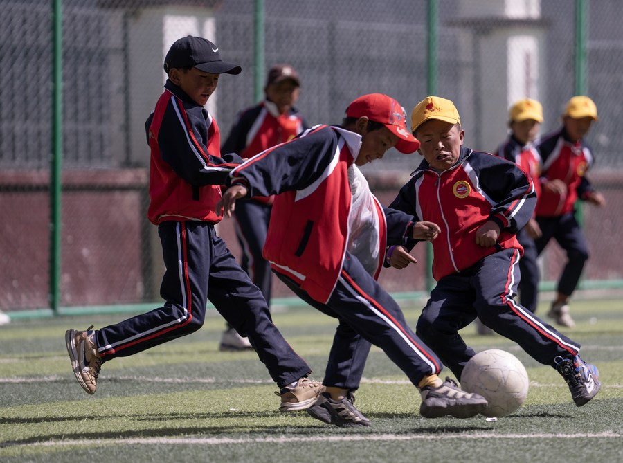 6月5日,扎西宗鄉(xiāng)完全小學的學生在人工草坪上踢足球。