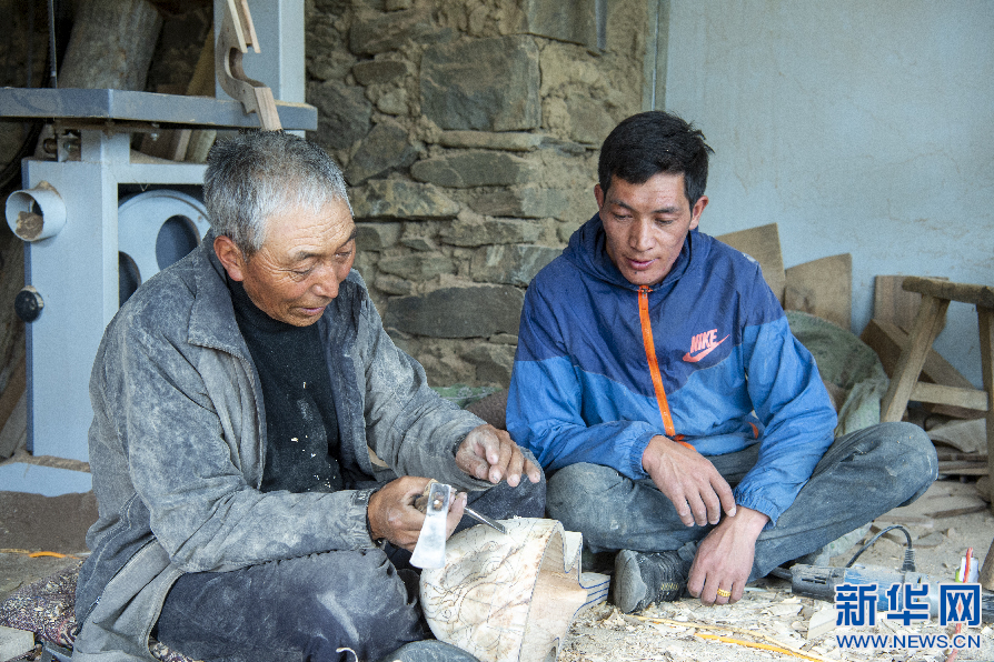 6月8日,娘嘎扎念琴制作技藝傳承人羅布次旦給兒子指導制作技藝。新華網(wǎng) 旦增努布 攝