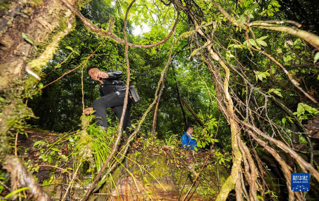 6月15日,國家重要野生植物種質(zhì)資源庫辰山中心負責人鐘鑫(下)和助手在攀爬亞洲第一高樹附近的高樹,采集數(shù)據(jù)。新華社記者 晉美多吉 攝