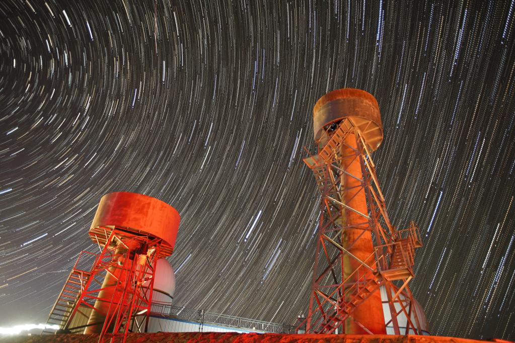 在拍攝天文臺星軌時,天空已經(jīng)完全黑了,在相機的取景器里并不能實時看見天空和星星以及其他的拍攝對象,這時候我們只能先長曝光拍一張圖,再結(jié)合自己拍好的圖,根據(jù)感覺來慢慢調(diào)整構(gòu)圖,再進行曝光拍攝。如此經(jīng)過三四次長曝光拍攝以后,才拍到了自己想要的圖片,我的一張星軌照片就是這樣被拍攝了出來。