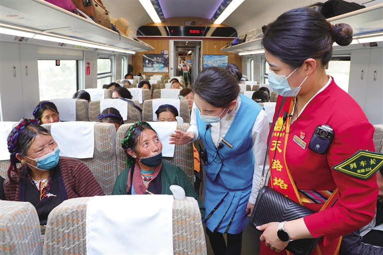 2022年初,青藏集團(tuán)有限公司在管內(nèi)各站、車開展“天路格?;ā逼放苿?chuàng)建以來,拉林鐵路各車站、各次列車上都能看到“天路格?;ā狈?wù)隊(duì)員,他們用真誠、熱情、熱心為每一位旅客提供溫馨細(xì)致的服務(wù)?!?月初,我?guī)е⒆觼砦鞑芈糜危?月20日前往林芝,游玩了三天,由于家里有事,不得不趕回去,就買了今天中午回拉薩的火車票,剛開車不久我姑娘就發(fā)燒,肚子痛。列車員看見孩子難受就詢問情況,并找來列車長周晶,通過廣播為我們找醫(yī)生,還好沒啥大事,就是腸胃感冒,我也就放心了。周晶車長也一直在旁邊幫我照顧孩子,拿濕毛巾擦臉,蓋毛毯,送來熱水,太細(xì)心了,讓我很感動。她們工作認(rèn)真負(fù)責(zé),服務(wù)周到,我一路上都親身感受到了高原動車的熱情?!痹?4日林芝到拉薩的C926次列車上,來自四川的高雅女士拉著記者激動地說。