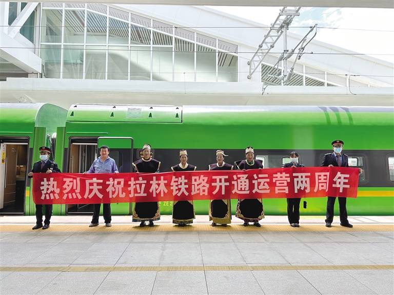 2021年6月25日,拉林鐵路開通運(yùn)營,結(jié)束了藏東南不通鐵路的歷史,復(fù)興號動車開到西藏,駛上拉林鐵路,拉薩至山南、林芝最快1小時4分、3小時30分可達(dá);山南至林芝最快2小時22分可達(dá),相比汽車,從拉薩到林芝的時間幾乎節(jié)省了一半,從山南到林芝,也節(jié)省了2個多小時。兩年來,隨著運(yùn)行方式逐漸成熟,鐵路方便、快捷的運(yùn)輸優(yōu)勢逐步顯現(xiàn),客流持續(xù)攀升,青藏集團(tuán)有限公司及時根據(jù)客流情況在周末、節(jié)假日、寒暑假等客流高峰期增開281趟臨時旅客列車。兩年來,拉林鐵路共運(yùn)送旅客182.5萬人次,運(yùn)輸貨物41.91萬噸,拉近了藏東南地區(qū)9個城市的距離,也深刻改變了當(dāng)?shù)厝嗣竦墓ぷ骱蜕钣^念。