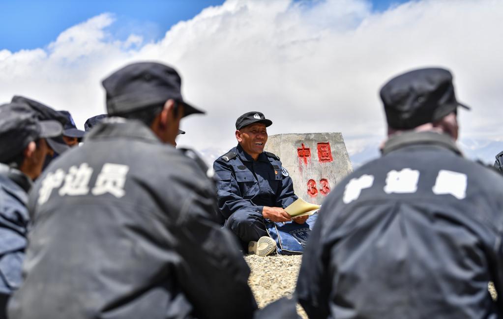 在33號(hào)界碑處,護(hù)邊隊(duì)在隊(duì)長的帶領(lǐng)下開展學(xué)習(xí)(6月2日攝)。新華社記者 晉美多吉 攝