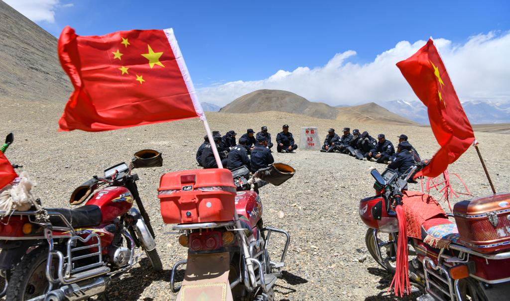 在33號(hào)界碑處,護(hù)邊隊(duì)在隊(duì)長石角(右二)的帶領(lǐng)下開展學(xué)習(xí)(6月2日攝)。新華社記者 晉美多吉 攝