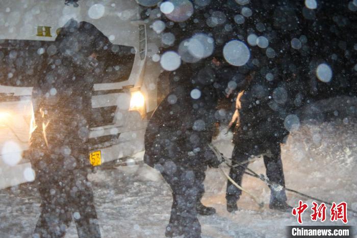 來到現(xiàn)場后楊軍發(fā)現(xiàn),該路段積雪超過半米深,車輛已經(jīng)深陷其中無法行駛。楊軍立即組織民警用鐵鍬鏟雪、人力助推、繩索牽引等進(jìn)行施救,經(jīng)過一個(gè)多小時(shí)的努力,成功將部分被困車輛救出??涩F(xiàn)場風(fēng)雪突然變大,下雪速度遠(yuǎn)超過救援速度,轉(zhuǎn)眼間,路面積雪接近1米高,到深夜時(shí),雙向車道上被困車輛、人員已達(dá)17輛、49人,看到情況越來越嚴(yán)峻,楊軍迅速對接、協(xié)調(diào)駐地交通部隊(duì)共同開展救援。