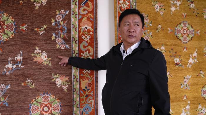 次旦向記者展示藏毯上的明朝圖案。 任帥 攝