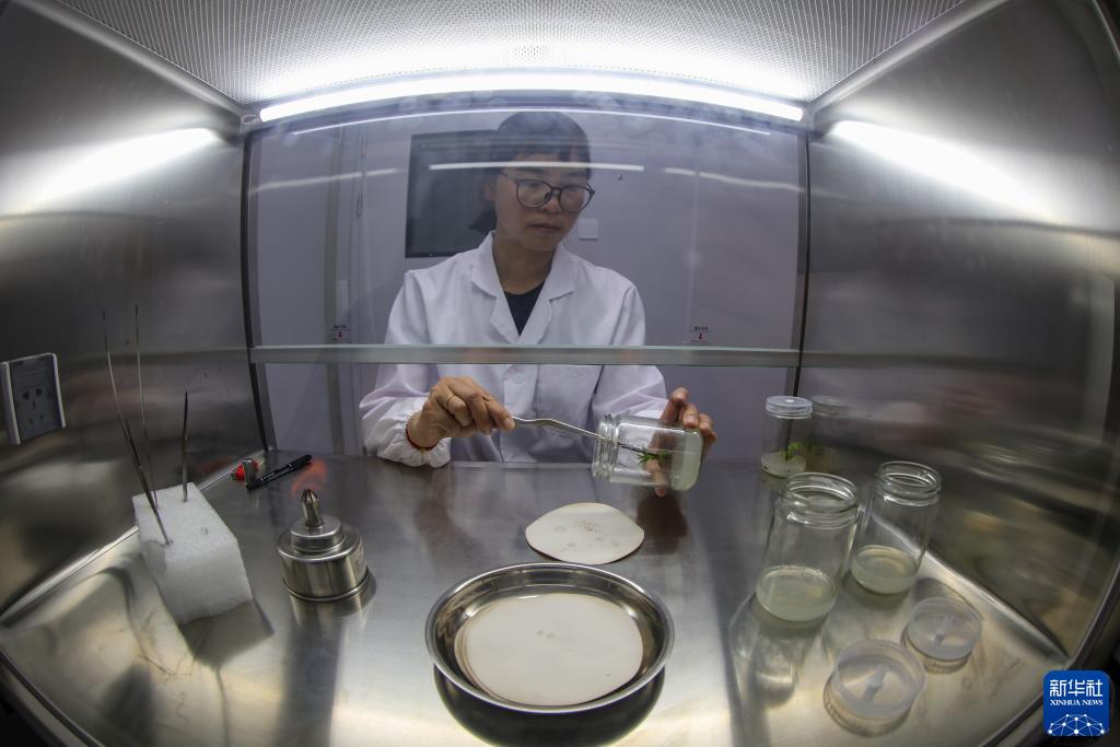 劉利平博士在高原核桃研究所用核桃組織培養(yǎng)標本做實驗(7月27日攝)。新華社記者 姜帆 攝