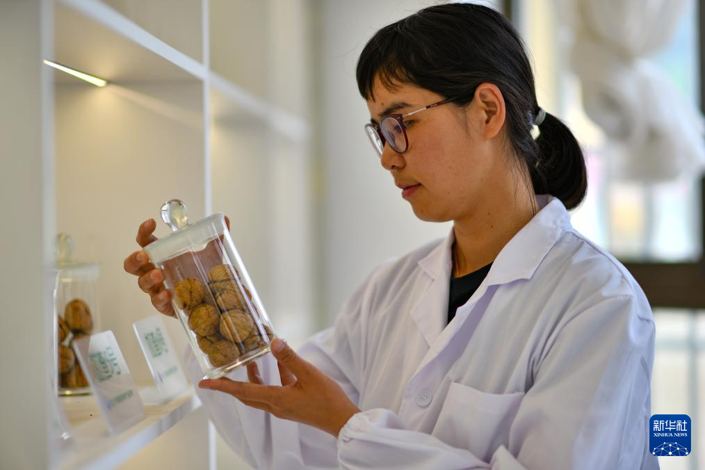 劉利平在長江大學(xué)西藏高原核桃產(chǎn)業(yè)研究所檢查核桃果實(shí)標(biāo)本(7月27日攝)。新華社記者 旦增尼瑪曲珠 攝
