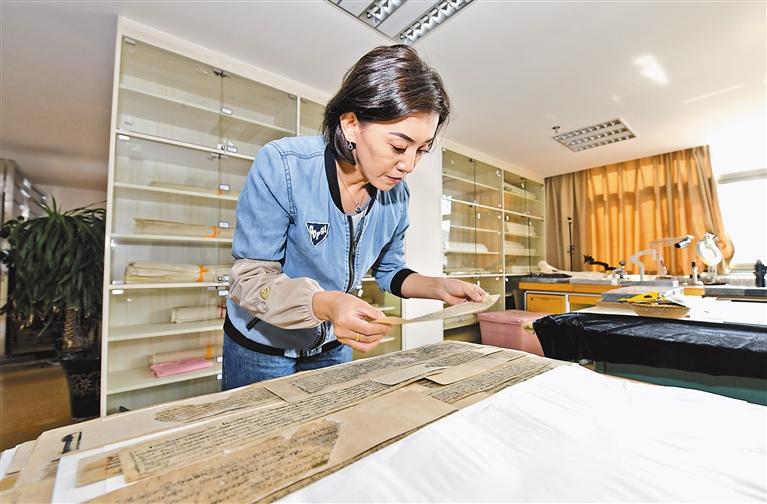 西藏自治區(qū)圖書(shū)館古籍保護(hù)中心工作人員在清理修復(fù)古籍。唐斌 攝