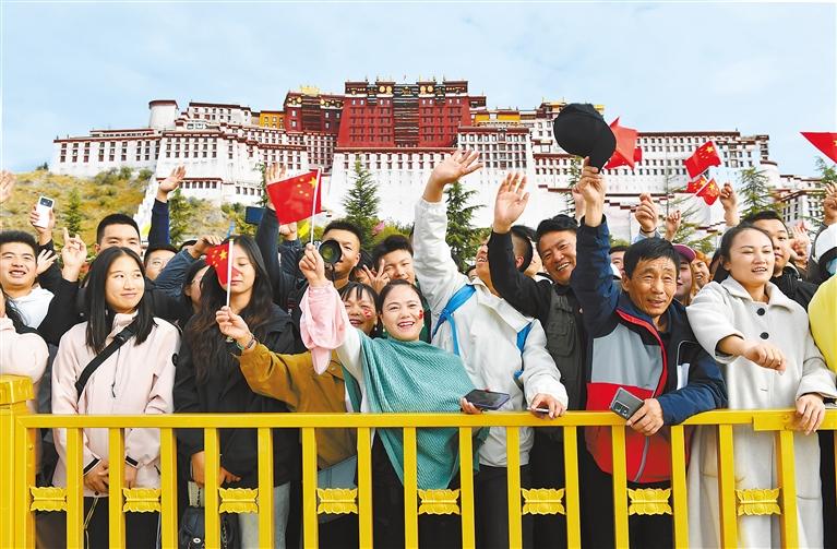 10月1日上午,西藏自治區(qū)慶祝中華人民共和國成立74周年“升國旗、唱國歌”儀式在布達(dá)拉宮廣場(chǎng)舉行。圖為群眾在觀看升旗儀式。記者 次仁平措 攝