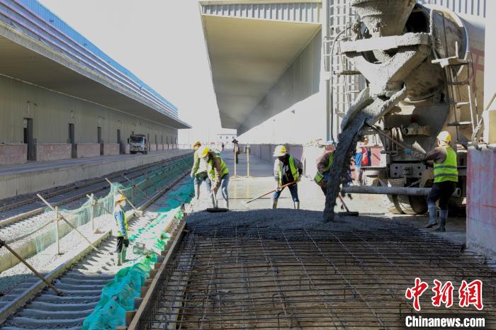 圖為西藏那曲物流園區(qū)綜合5站臺大修施工現(xiàn)場進(jìn)行混凝土澆筑作業(yè)。馬生明 攝