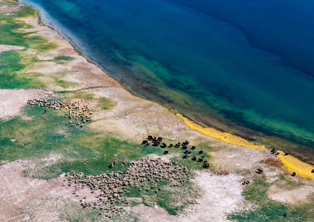 牧民在阿里地區(qū)日土縣班公湖畔放牧白絨山羊(無人機(jī)照片,9月21日攝)。新華社記者 姜帆 攝