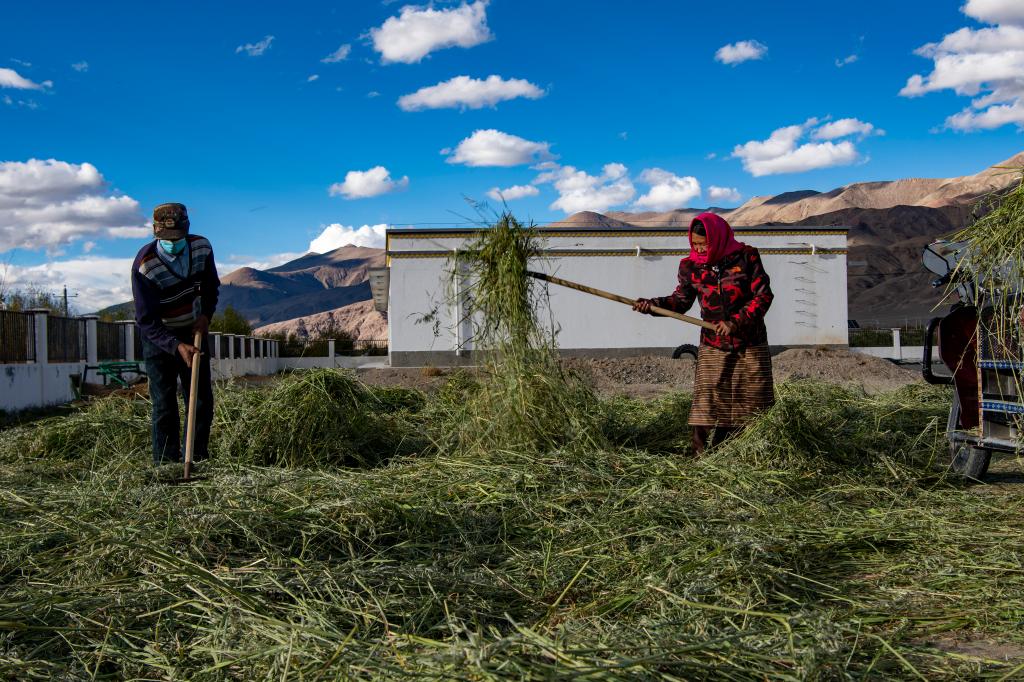 阿里地區(qū)噶爾縣昆莎鄉(xiāng)噶爾新村村民在場(chǎng)院晾曬紫花苜蓿(9月20日攝)。新華社記者 姜帆 攝