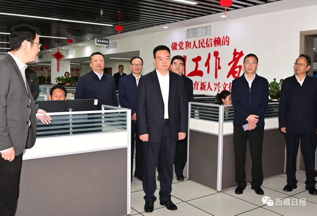 2023年9月25日,自治區(qū)黨委書記王君正來到西藏日報社、西藏廣播電視臺調(diào)研。這是王君正在西藏日報社詳細(xì)了解市場化運(yùn)營、全媒體傳播體系建設(shè)、媒體深度融合發(fā)展等情況。記者 旦增西旦 攝