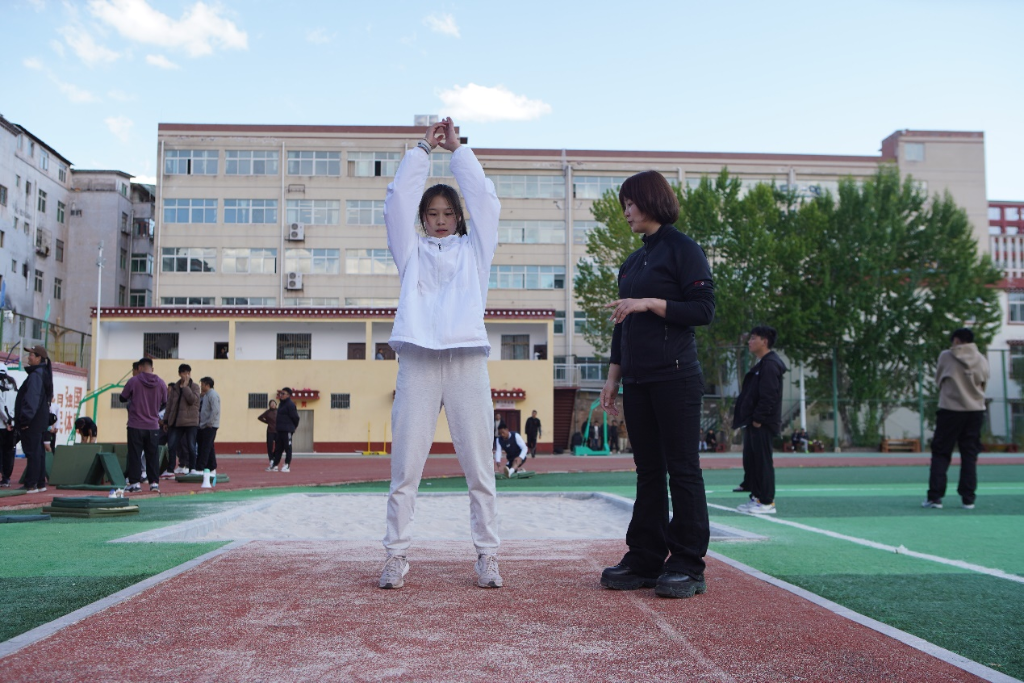 馬曉衛(wèi)正在指導昌都市第一高級中學的學生立定跳遠。新華社記者 邵澤東 攝