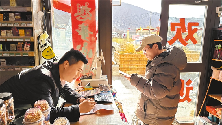圖為多瑪鄉(xiāng)商戶劉世鵬(左)在為購物者結賬。記者 婁夢琳 攝
