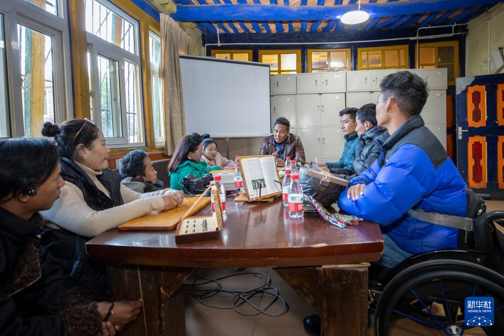 西藏拓崗文化傳播有限公司負(fù)責(zé)人覺列(右一)在直播前與直播團(tuán)隊討論直播方案(11月10日攝)。新華社記者 姜帆 攝