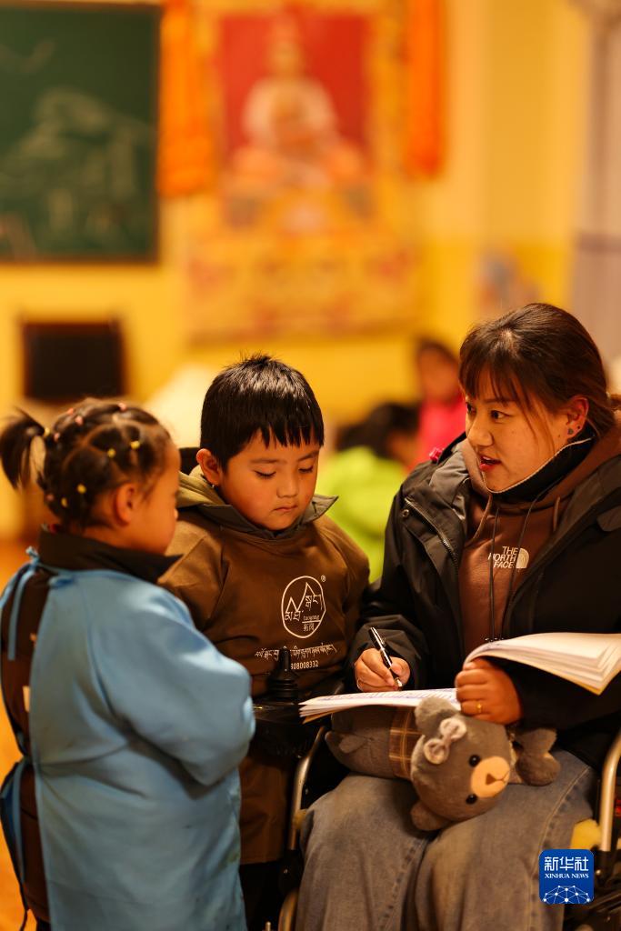 卓嘎在藏文書法班上輔助老師上課(12月2日攝)。新華社記者 晉美多吉 攝