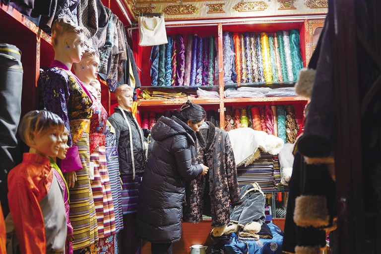 “最近越來越冷了,所以我今天來給女兒買一件厚點(diǎn)的藏裝,剛好她生日也快到了。”走進(jìn)位于北京東路的222藏裝店,琳瑯滿目、顏色絢麗的冬款藏裝讓人眼前一亮,市民尼瑪拉姆正在給女兒挑選藏裝。一旁,店員則在給客人測(cè)量三圍、取藏裝、介紹款式,忙得不可開交。