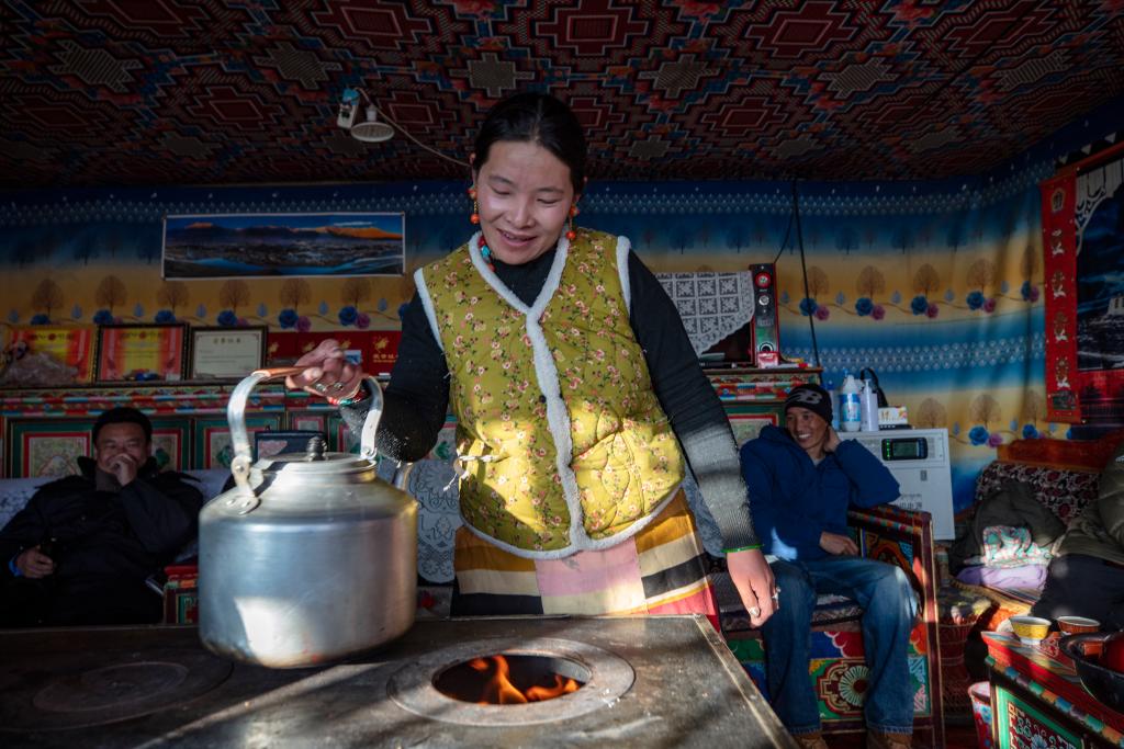 俄久鄉(xiāng)馬遷村嘎宗的家中明亮整潔,過冬的厚衣服摞在座椅上。將牛糞投入爐子中點燃,屋里的溫度逐漸升高。燒一壺?zé)崴?,喝一杯熱茶,屋外茫茫草原上的狂風(fēng),頓時變得不再可怕。嘎宗和女兒圍坐在爐邊,露出了笑容。