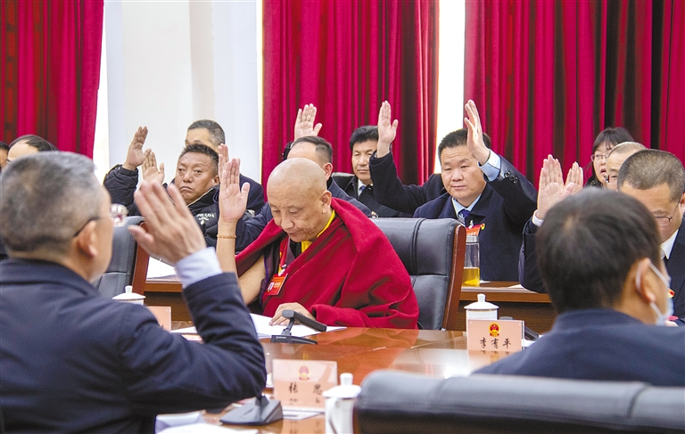 圖為日喀則市第二屆人民代表大會第四次會議主席團第一次會議主席團成員舉手表決。