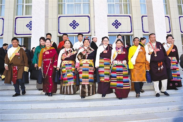 代表們在西藏人民會堂前合影留念。記者 王敏 攝