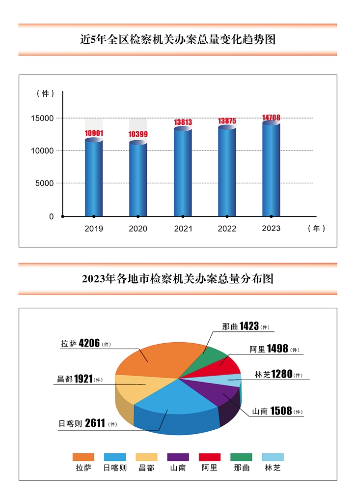“2023年,全區(qū)檢察機(jī)關(guān)在自治區(qū)黨委和最高檢正確領(lǐng)導(dǎo)下,以習(xí)近平新時(shí)代中國(guó)特色社會(huì)主義思想為指導(dǎo),深入貫徹習(xí)近平法治思想、習(xí)近平總書記關(guān)于西藏工作的重要指示和新時(shí)代黨的治藏方略,全面貫徹黨的二十大精神、自治區(qū)第十次黨代會(huì)和十屆區(qū)黨委歷次全會(huì)精神、全國(guó)檢察長(zhǎng)會(huì)議精神,認(rèn)真落實(shí)自治區(qū)十二屆人大一次會(huì)議決議,自覺把檢察工作放到黨的治藏穩(wěn)藏興藏大局中謀劃推進(jìn),聚焦‘四件大事’聚力‘四個(gè)創(chuàng)建’,忠誠(chéng)依法能動(dòng)高質(zhì)效履職取得新成效。全年辦理各類法律監(jiān)督案件14708件,同比增長(zhǎng)6%。依法主動(dòng)辦案8030件,占54.6%,主動(dòng)辦案量首次超過(guò)被動(dòng)受理案件量。‘四大檢察’結(jié)構(gòu)持續(xù)優(yōu)化為56∶18∶7∶19,業(yè)務(wù)質(zhì)效穩(wěn)步提升?!?月8日下午,西藏自治區(qū)人民檢察院檢察長(zhǎng)夏克勤在西藏自治區(qū)第十二屆人民代表大會(huì)第二次會(huì)議上作工作報(bào)告。報(bào)告全面反映了西藏檢察機(jī)關(guān)一年來(lái)始終牢記“國(guó)之大者”,以實(shí)現(xiàn)“努力讓人民群眾在每一個(gè)司法案件中感受到公平正義”為目標(biāo),深入踐行“高質(zhì)效辦好每一個(gè)案件”,充分發(fā)揮檢察職能作用,在為大局服務(wù)、為人民司法、為法治擔(dān)當(dāng)中所做的主要工作,同時(shí)描繪了2024年的西藏檢察工作藍(lán)圖。