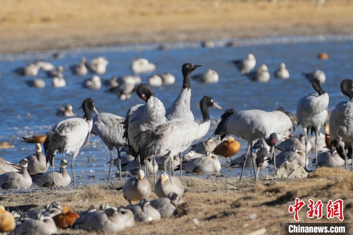 圖為在日喀則市拉孜縣越冬的黑頸鶴。盧曉娜 攝