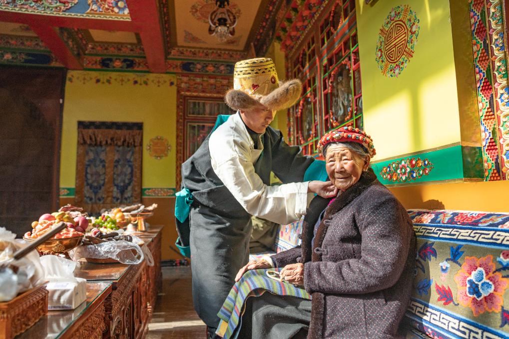 按照傳統(tǒng)習俗,巴桑普尺一家人盛裝迎新。男性長輩外著氆氌藏袍,頭頂金絲帽,腳蹬藏靴;女性長輩身穿真絲綢緞衫,搭配無袖藏袍,胸前佩戴綠松石、瑪瑙、珊瑚等首飾;小輩們也都穿上了嶄新藏裝。