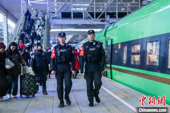 圖為春運(yùn)首日,拉薩鐵路公安處特警巡查即將發(fā)送的列車(chē)。王興楠 攝