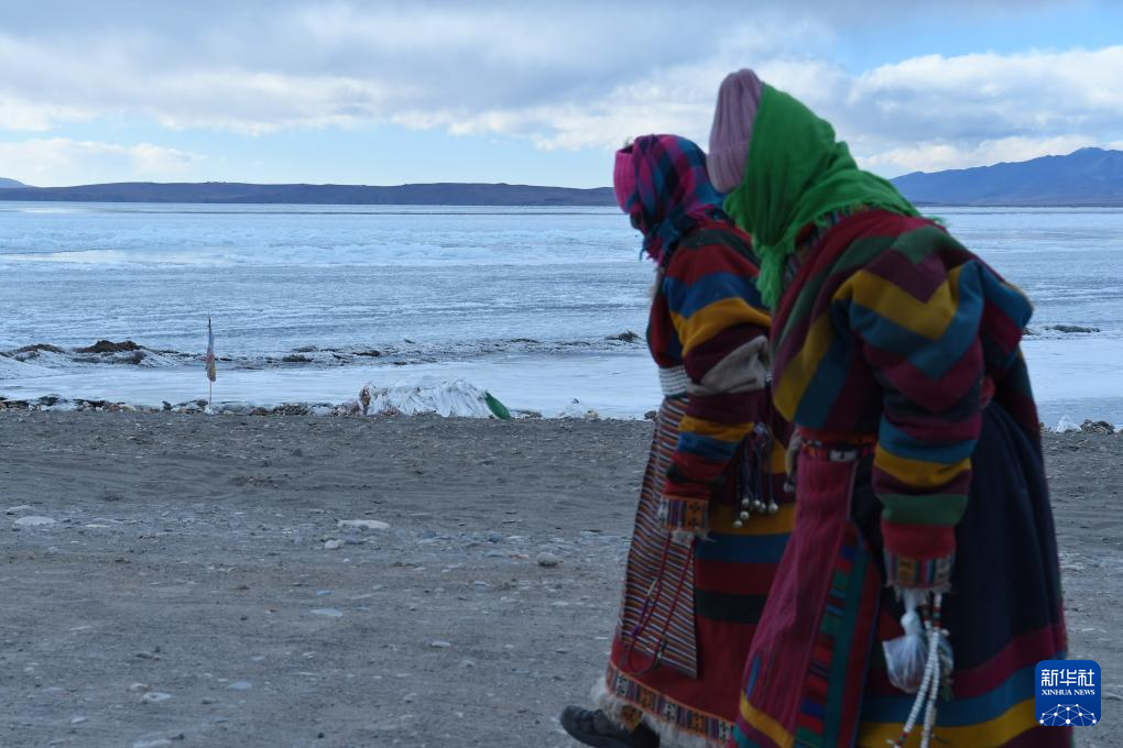 兩位老人從瑪旁雍錯(cuò)岸邊走過(1月29日攝)。新華社記者 劉文博 攝