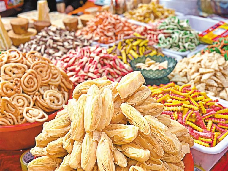 走進(jìn)拉薩年貨集中購買地之一的八廓商城,切瑪盒、卡賽、糖果、酥油花、青稞苗等年貨擺滿各個攤位,叫賣聲、討價還價聲好不熱鬧。