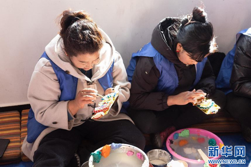 圖為西藏現(xiàn)代服務(wù)業(yè)技工學(xué)校的學(xué)員正在制作卡塞“德格”(1月29日攝)。新華網(wǎng)發(fā) 李騰 攝