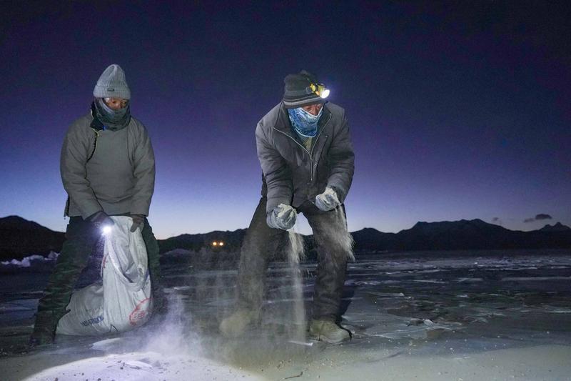 2月1日凌晨5點(diǎn),記者從浪卡子縣趕往推瓦村。村口停放的小貨車?yán)?,整齊地堆放著裝有爐灰的麻袋。村民旺堆告訴記者,冬季里,推瓦村草場(chǎng)不能為羊群提供充足的牧草,而普莫雍措湖心島有著豐茂的水草。因此,在普莫雍措結(jié)冰期,村民們會(huì)將羊群趕到湖心島,湖面解凍前再把羊群趕回村里。