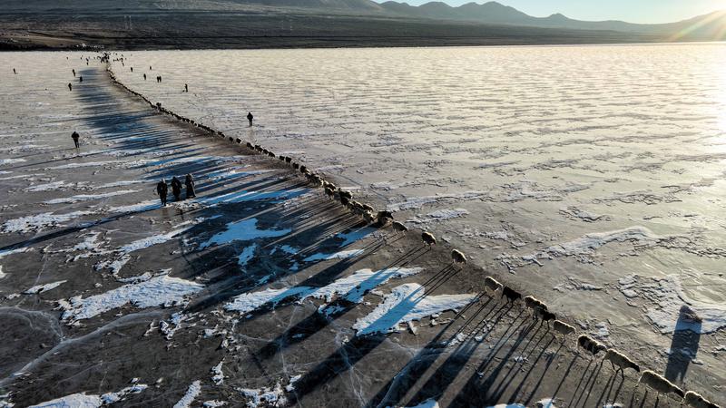 去往湖心島的路程大約3公里,走在冰面上,偶爾響起的冰層破裂聲還是讓人不由得心驚。此刻,幾百只羊宛如一條長(zhǎng)長(zhǎng)的直線,在牧羊人的指揮下緩慢前行。金色的太陽(yáng)露出地平線,羊群的影子投射在藍(lán)色的冰面上,美不勝收。