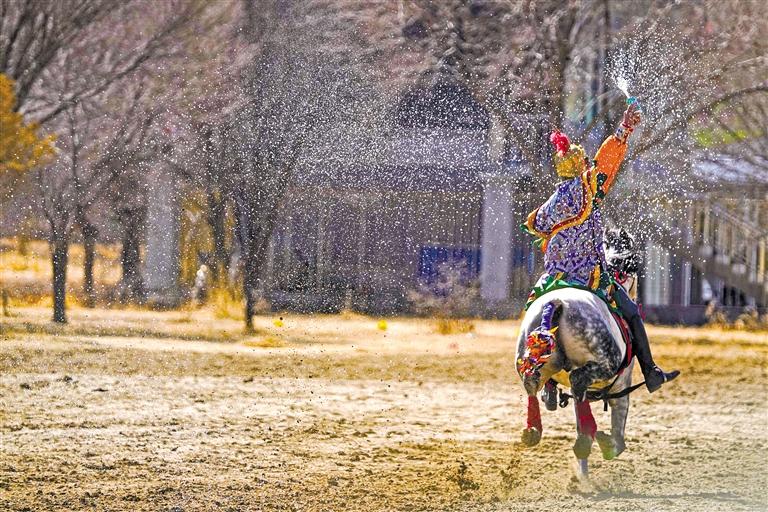 手捧潔白的哈達(dá)和鮮花,騎手們揚(yáng)鞭策馬走上賽場,用策馬奔騰、賽場競技和騎馬拾哈達(dá)、騎馬射箭等精彩表演,為觀眾送上新年的祝福。