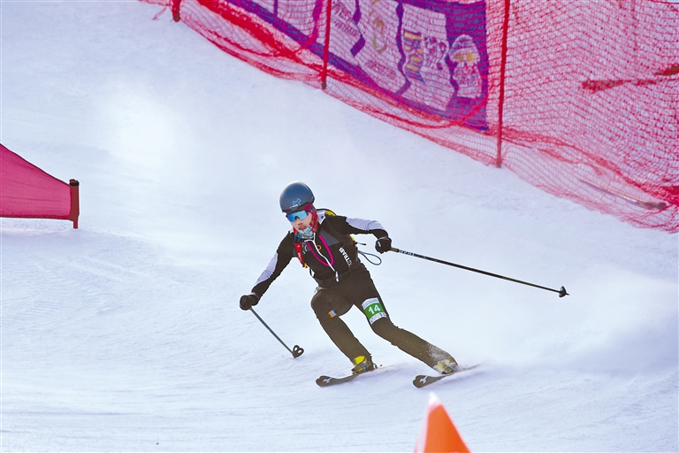 此次比賽共有兩條賽道,呈字母Y形,賽道全長1100米,累計爬升130米。選手們分別需要完成兩次穿板上升、轉(zhuǎn)換下滑,然后在接力區(qū)身體觸碰完成接力,比賽充滿挑戰(zhàn)。