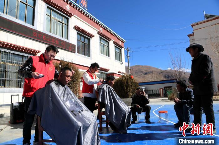 圖為理發(fā)店店長劉陽(左一)為民眾提供免費理發(fā)服務。倫珠澤仁攝
