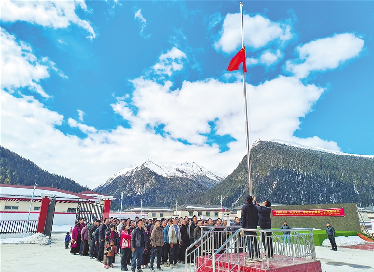 3月28日,米林市里龍鄉(xiāng)才巴村朗貢搬遷點的群眾舉行紀念西藏百萬農奴解放65周年升國旗儀式。周宇 記者 丹增群培 攝