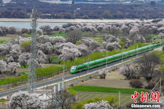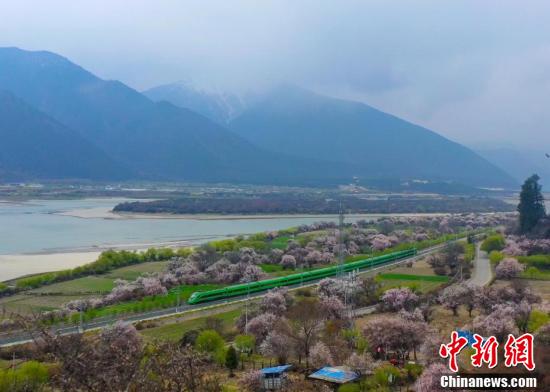 穿梭在桃花林中的拉林鐵路高原復興號。
