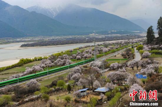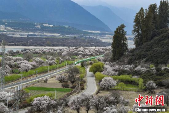 3月下旬至4月,西藏拉薩至林芝鐵路(拉林鐵路)沿線綿延的野生桃花林盛開,復興號動車組穿行在桃花海間,成為拉林鐵路春天最美的點綴。圖為穿梭在桃花林中的拉林鐵路高原復興號。