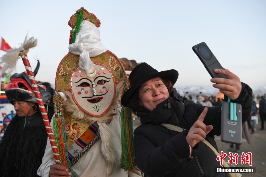 游客跟演職人員合影。中新社記者 貢嘎來松 攝