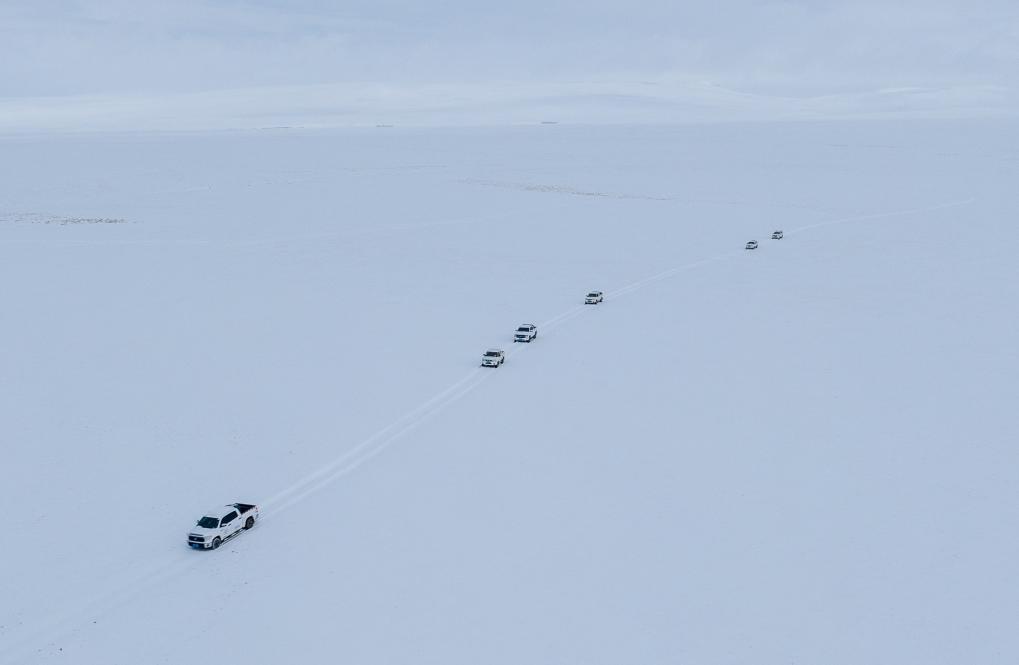 野生動物專業(yè)管護隊員的車隊在大雪中巡護(無人機照片,5月8日攝)。新華社記者 丁增尼達 攝