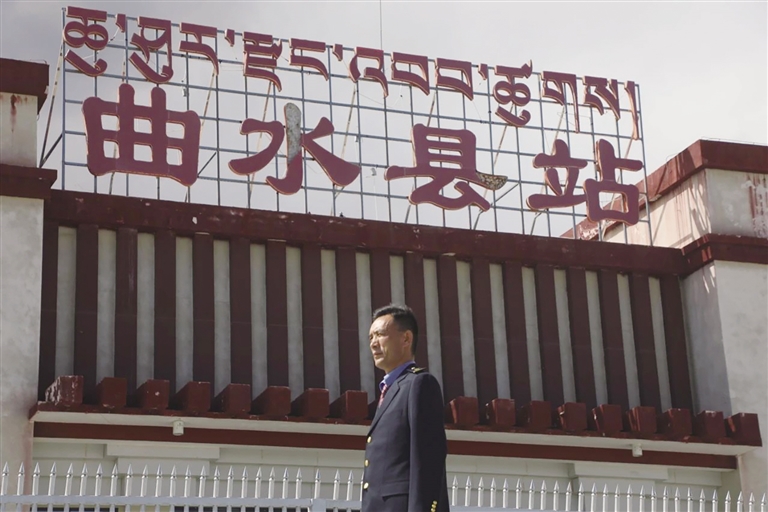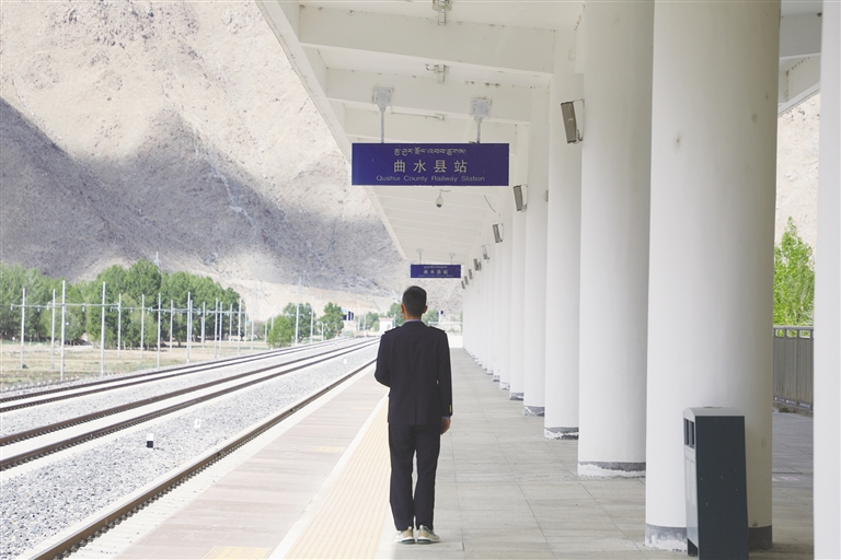 每天,清晨的第一縷陽光還未穿透遠(yuǎn)方的山巒時,車站值班員賀文貴已經(jīng)站在曲水站的站臺上,開始了他日復(fù)一日的工作,查看股道是否有異物,是否有動物進(jìn)入站場。曲水站與其他站不一樣,根據(jù)工作安排,平時這里只有一個人當(dāng)班應(yīng)急值守,沒有旅客上下站,時而駛過的火車,是這里唯一的來客。目之所及,只有遠(yuǎn)處的雪山、農(nóng)田和滾滾向前的雅魯藏布江水。