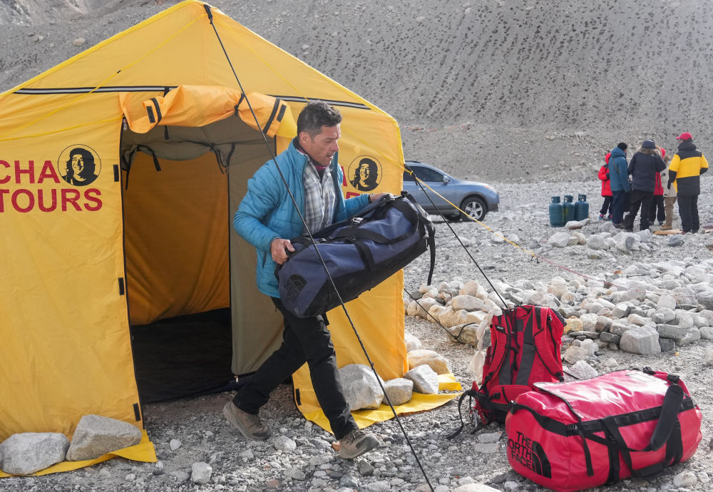 在珠峰登山大本營,哥哥多米尼克·德諾埃爾正在搬運登山物資(5月18日攝)。新華社記者 丁汀 攝
