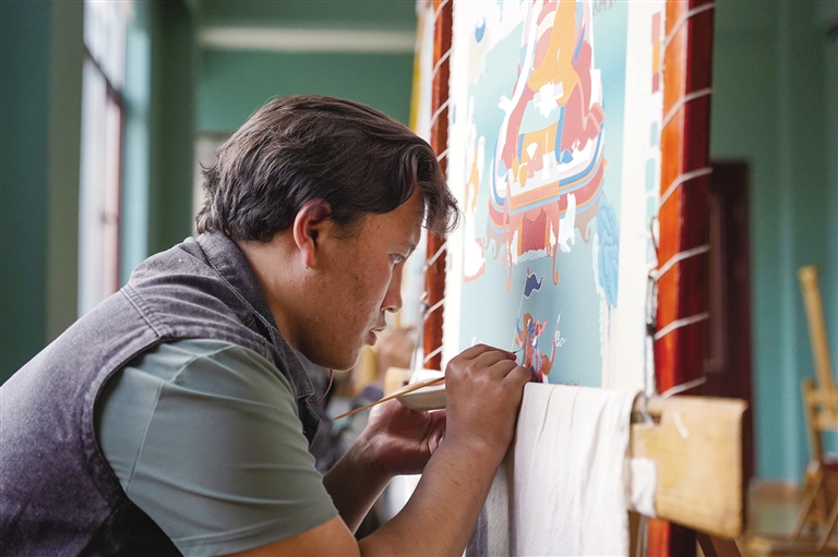 唐卡,2006年被列入國家非遺名錄,其題材豐富,包含歷史、文化和生活。昌都嘎瑪嘎赤畫派傳承人羅珠巴松出生在唐卡世家,是嘎赤派大師烏欽·敦德拉松的后代,他自幼學習唐卡,7歲啟蒙,8年筑基,19歲獨立創(chuàng)作,21歲收徒,31歲被認定為自治區(qū)級非遺傳承人,41歲被認定為國家級非遺傳承人。在西藏嘎欽唐卡畫院,他分享了自己學習、傳承發(fā)揚唐卡的故事。